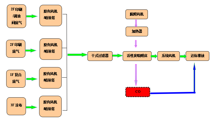 根據(jù)該公司的要求及我司有機廢氣的治理經(jīng)驗,采用干式過濾、活性炭吸附處理有機廢氣,活性炭吸附飽和以后采用CO催化氧化裝置對其進行脫附。
