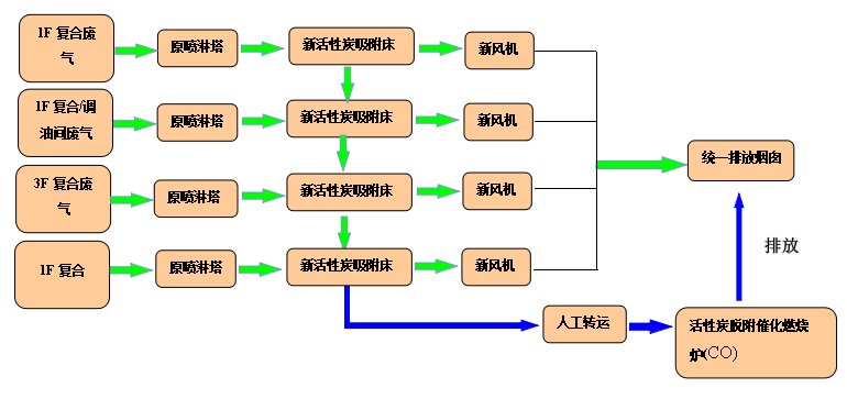 目前該公司在各車間根據(jù)不同的生產(chǎn)工藝分類收集廢氣匯入主風管,主風管接入指定廠房排風井,經(jīng)風井在離心風機的牽引作用下引入屋面廢氣治理設(shè)施,對于低濃度廢氣采用的是水噴淋吸收法,對于高濃度廢氣采用的是水噴淋吸收+活性炭吸附法,該公司為響應(yīng)環(huán)保要求,擬對廢氣處理設(shè)施提標改造。