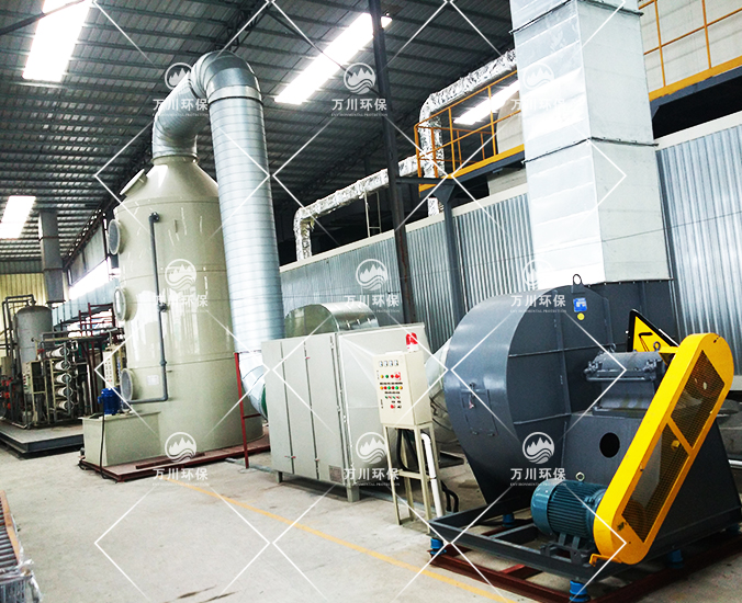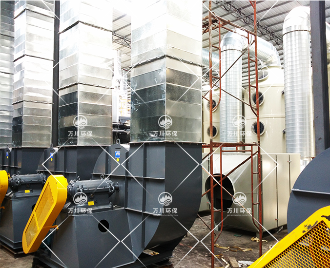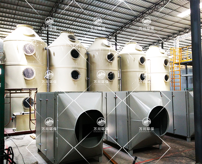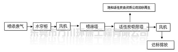 根據(jù)廠方提供的資料及現(xiàn)場勘察的情況。其噴漆廢氣的來源主要為無塵噴漆車間內(nèi)的5條自動噴涂線。在生產(chǎn)過程中有噴漆,該工序產(chǎn)生了一定量含三苯有機廢氣和噴漆粉塵,該廢氣不僅對環(huán)境造成污染,而且對人體有較大的危害作用,同時也破壞了周邊的環(huán)境,造成了不良的影響,需進行處理后排放。我們工程師分析了該廢氣的特點和以往的案例經(jīng)驗,采用了“水簾柜+噴淋塔+活性炭吸附塔”這套解決方案。